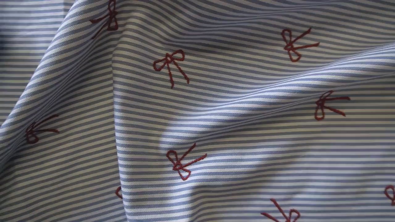 This playful shirting fabric pairs crisp sky-blue and white yarn-dyed pinstripes with a deep red bow embroidery scattered across the surface. The embroidery is evenly spaced and directional, giving a whimsical feel without overwhelming the classic stripe. The base has a fine twill weave, offering a gentle diagonal texture and a slightly structured drape.